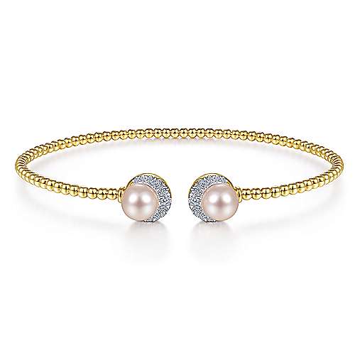 14K Yellow Gold Bujukan Split Cuff with Pearl and Diamond Halo Caps
