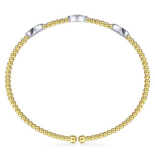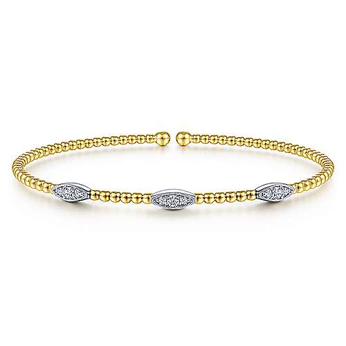 14K White-Yellow Gold Bujukan Bead Cuff Bracelet with Diamond Filled Marquise Stations
