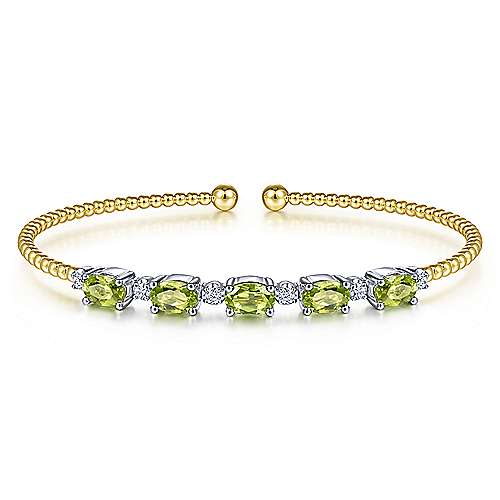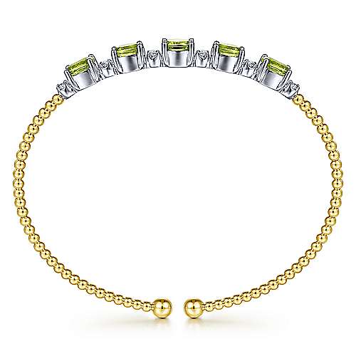 14K White-Yellow Gold Bujukan Bead Cuff Bracelet with Peridot and Diamond Stations