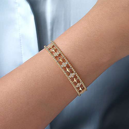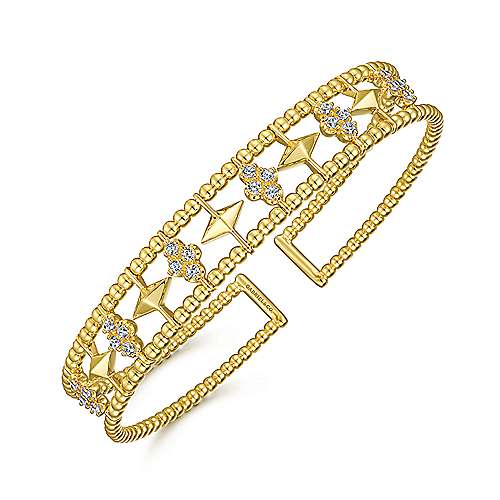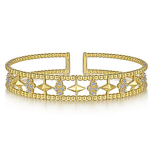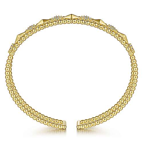 14K Yellow Gold Bujukan Bead Cuff Bracelet with Inner Diamond Cluster and Gold Pyramid Connectors.