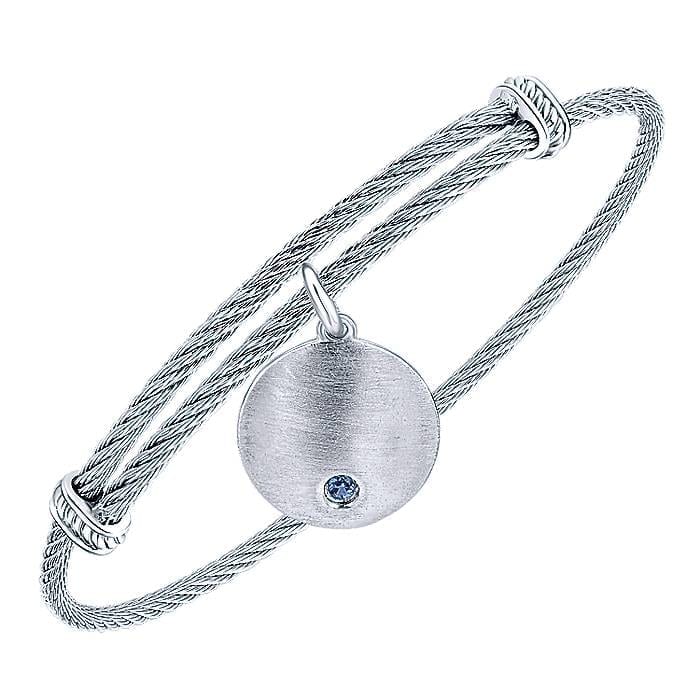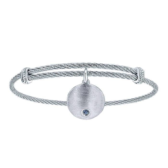 Round Brushed Silver Charm with Dainty Dark Sapphire Accent on 925 Sterling Silver and Stainless Steel Bangle