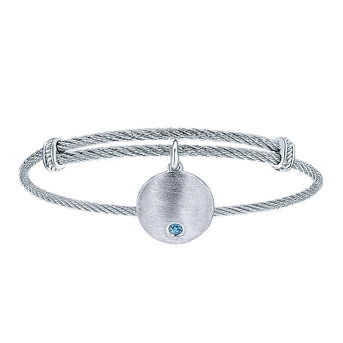Round Brushed Silver Charm with Swiss Blue Topaz Accent on 925 Sterling Silver and Stainless Steel Bangle