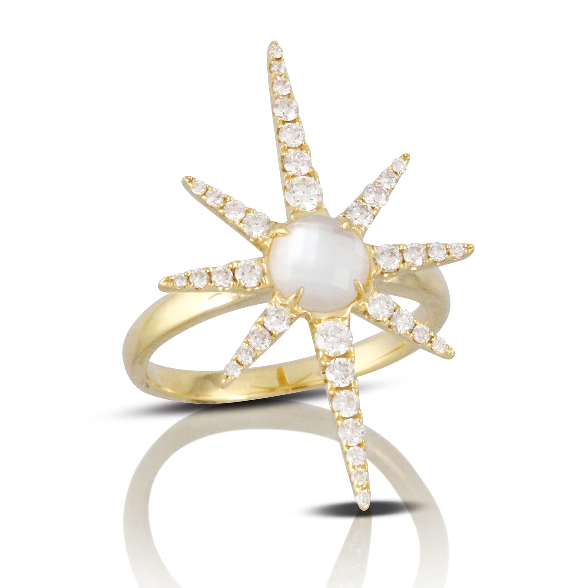 Shards of 18k Yellow Gold With Diamonds With Clear Quartz Over White Mother Of Pearl Ring