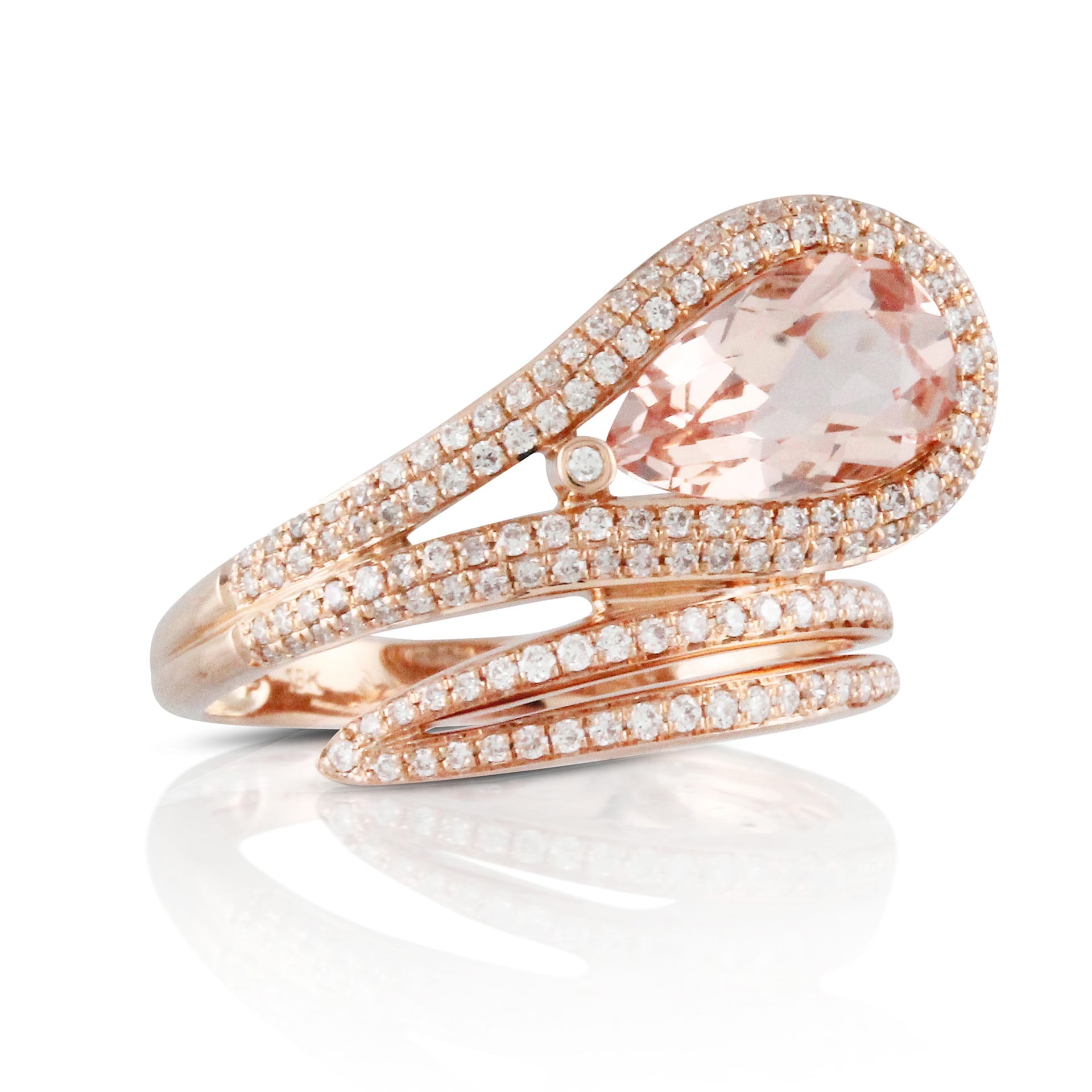 Spiral Tail With Sideways Teardrop Morganite Set in Warm 18k Rose Gold And Covered With Diamonds Ring