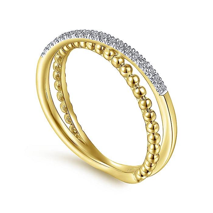 Split Shank Ring Features Strands Of Sparkling .09Ct Pave Diamonds And Overlapping Beaded 14k Yellow Gold