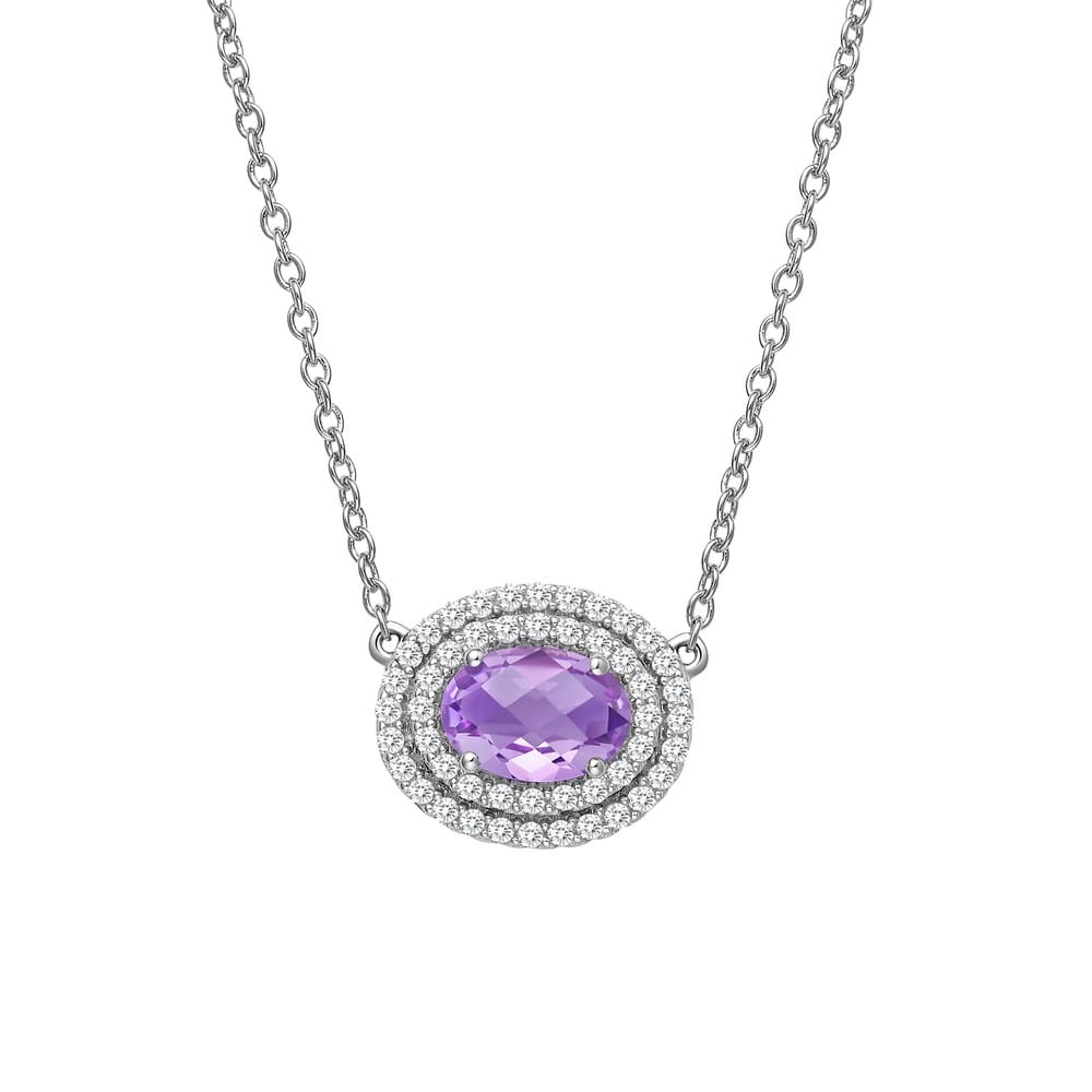 stunning double-halo Aria pendant necklace center stone set with a genuine oval cushion checkerboard-cut amethyst surrounded by simulated diamonds in sterling silver bonded with platinum