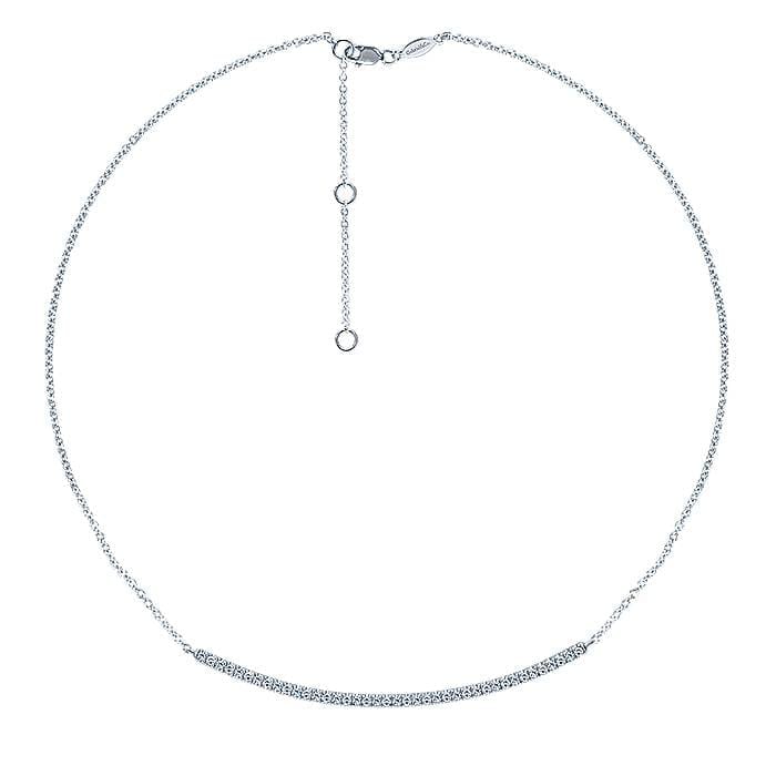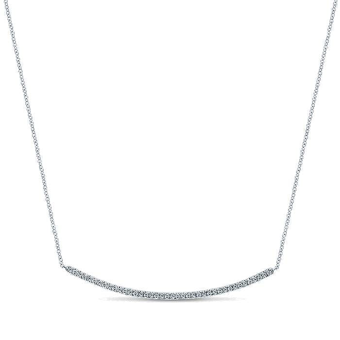 Tasteful 14k White Gold Fashion Necklace Features Single Long Curved Bar of Sparkling Diamonds