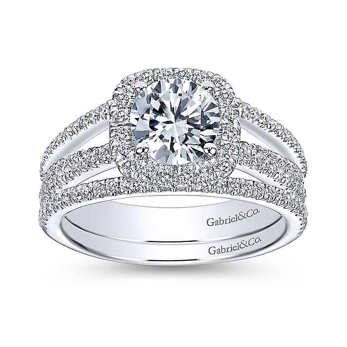 Three Dazzling Rows of Diamonds on Split Shank Band With Halo Center in 14k White Gold Engagement Ring Setting