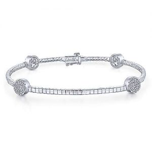 14K White Gold Tennis Bracelet with Round Cluster Diamond Stations