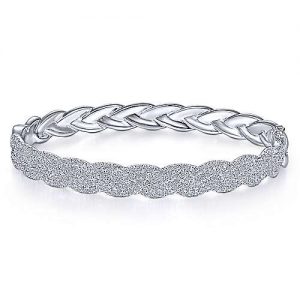 Wide 14K White Gold Round and Baguette Diamond Bangle Bracelet