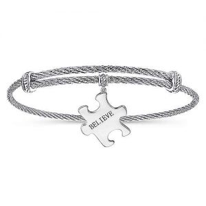 Twisted Cable Stainless Steel Bangle with Sterling Silver Believe Puzzle Piece Charm