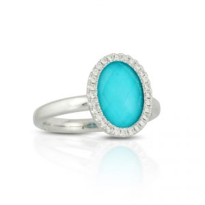 Oval Bring 18k White Gold Diamond Ring With White Topaz Over Turquoise